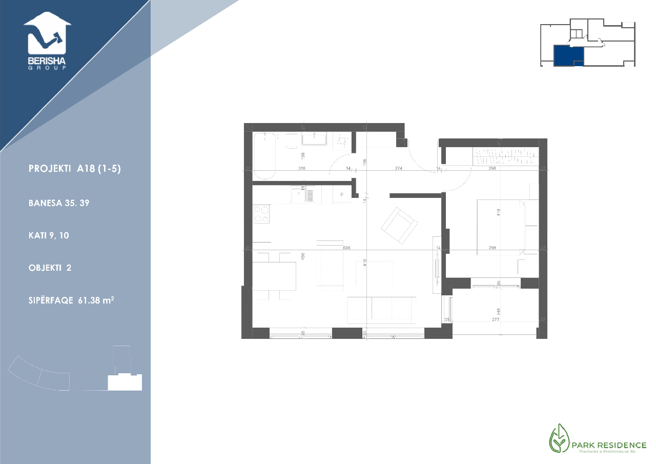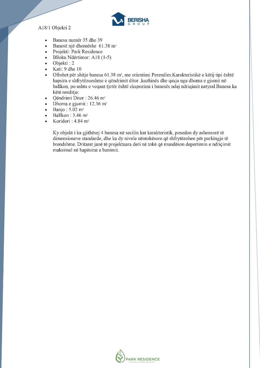• Ofrohet për shitje banesa 61.38 m², me orientim nga Perendimi. Karakteristikë e këtij tipi është hapsira e shfrytëzueshme e qëndrimit ditor, kuzhinës dhe qasja nga dhoma e gjumit në ballkon, po ashtu e veqant tjetër është ekspoyimi i banesëses ndaj ndriqimit natyral.
