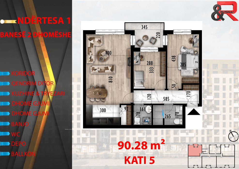 NDËRTESA 1 BANESË 2 DHOMËSHE 90.28 m² KATI 5 -KORIDOR -QENDRIM DITOR -KUZHINE & TRYEZARI -DHOME GJUMI -DHOME GJUMI -BANJO -WC -DEPO -BALLKON
