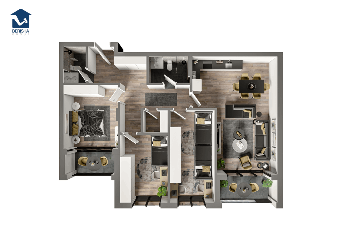 Ofrohet për shitje banesa me tri dhoma gjumi 126.96 m² ,me orientim Jug. Karakteristikë e kësaj banese është hapësira e shfrytëzueshme e qëndrimit ditor me qasje në ballkon, e pozicionuar në Jug ndërsa njëra nga tri dhomat e gjumit ka qasje në ballkonin e dytë.